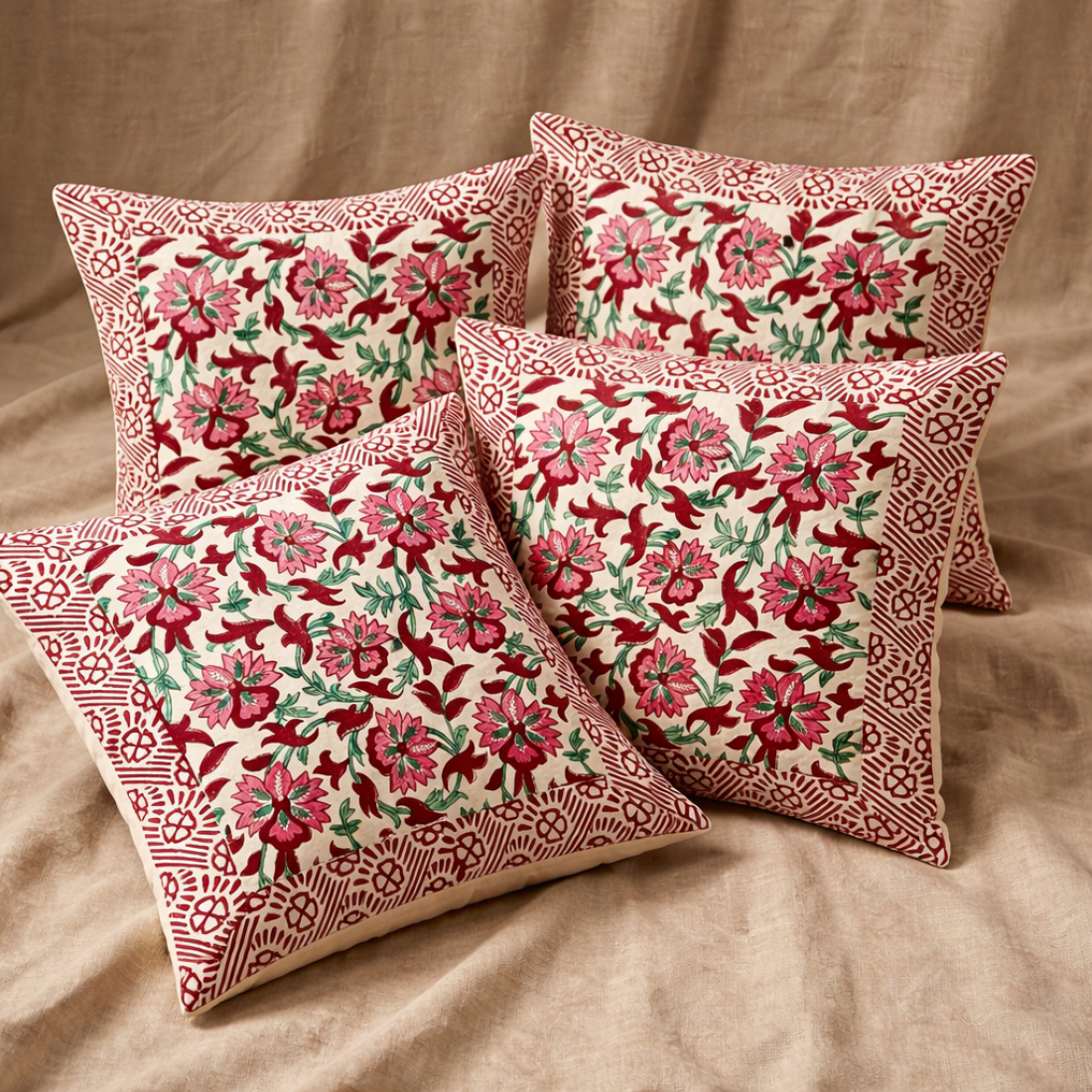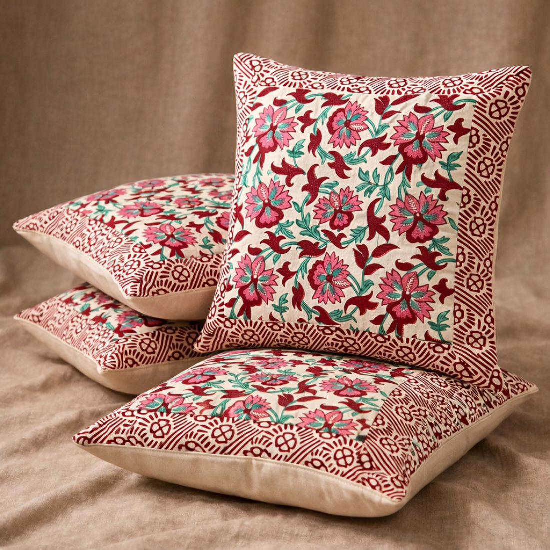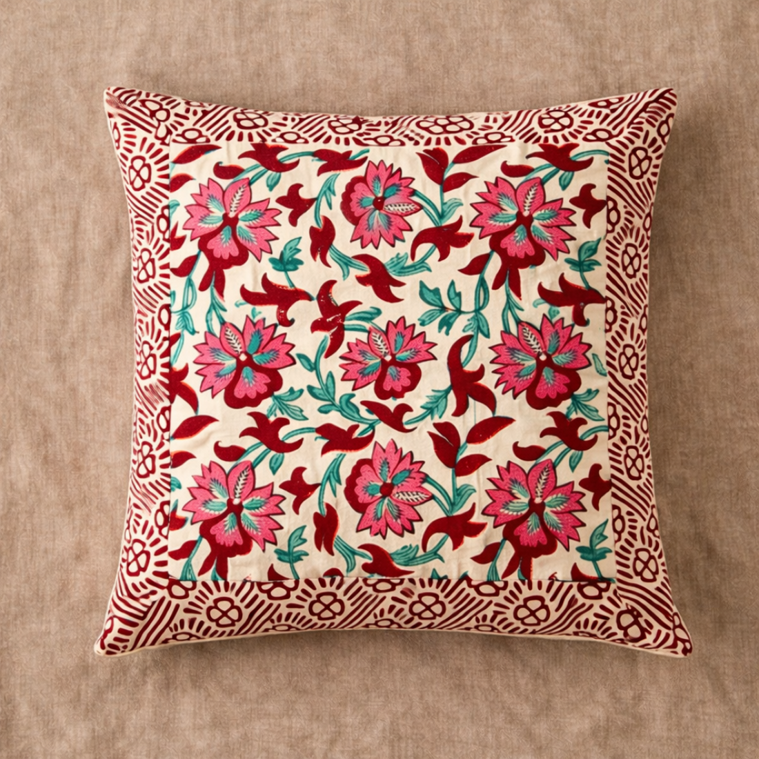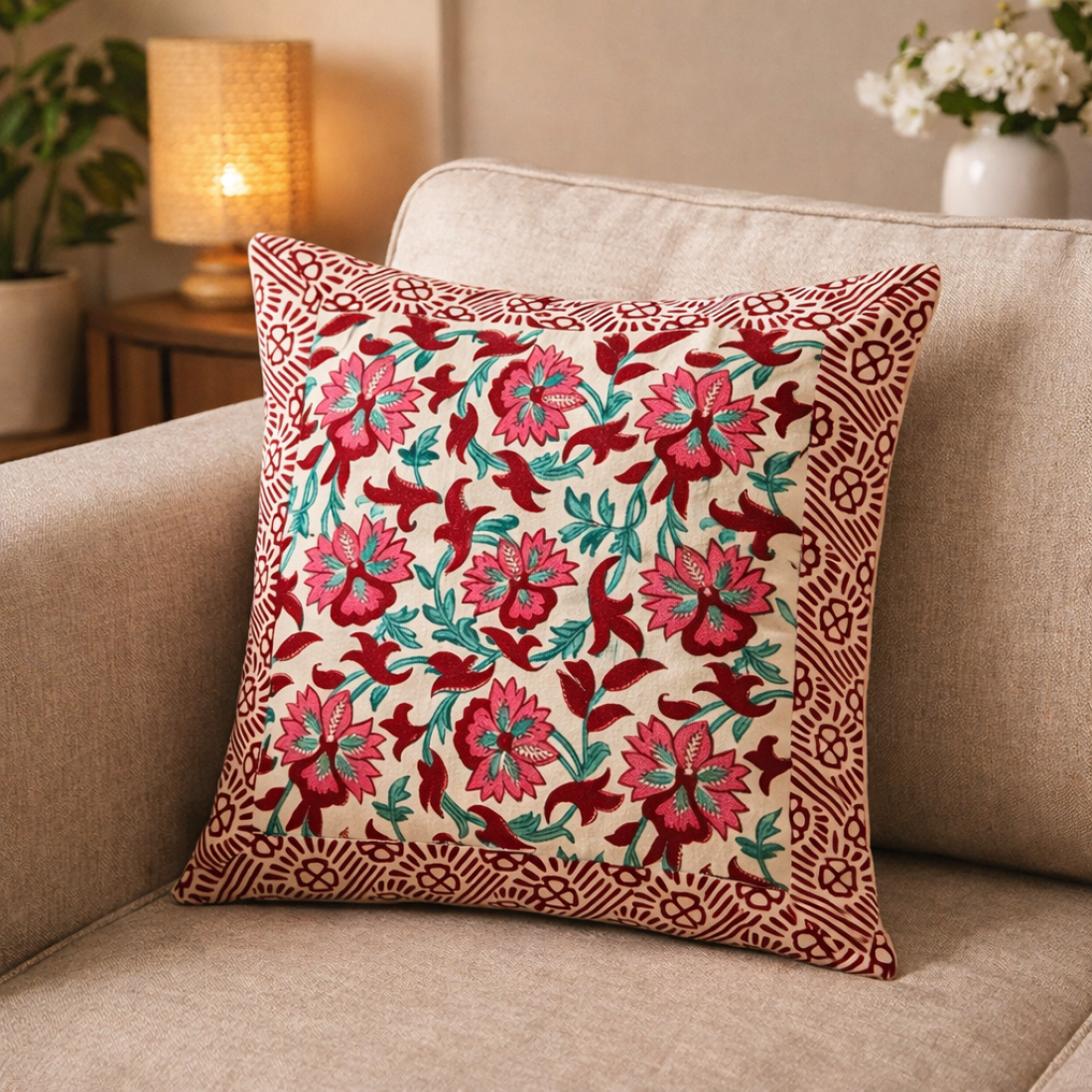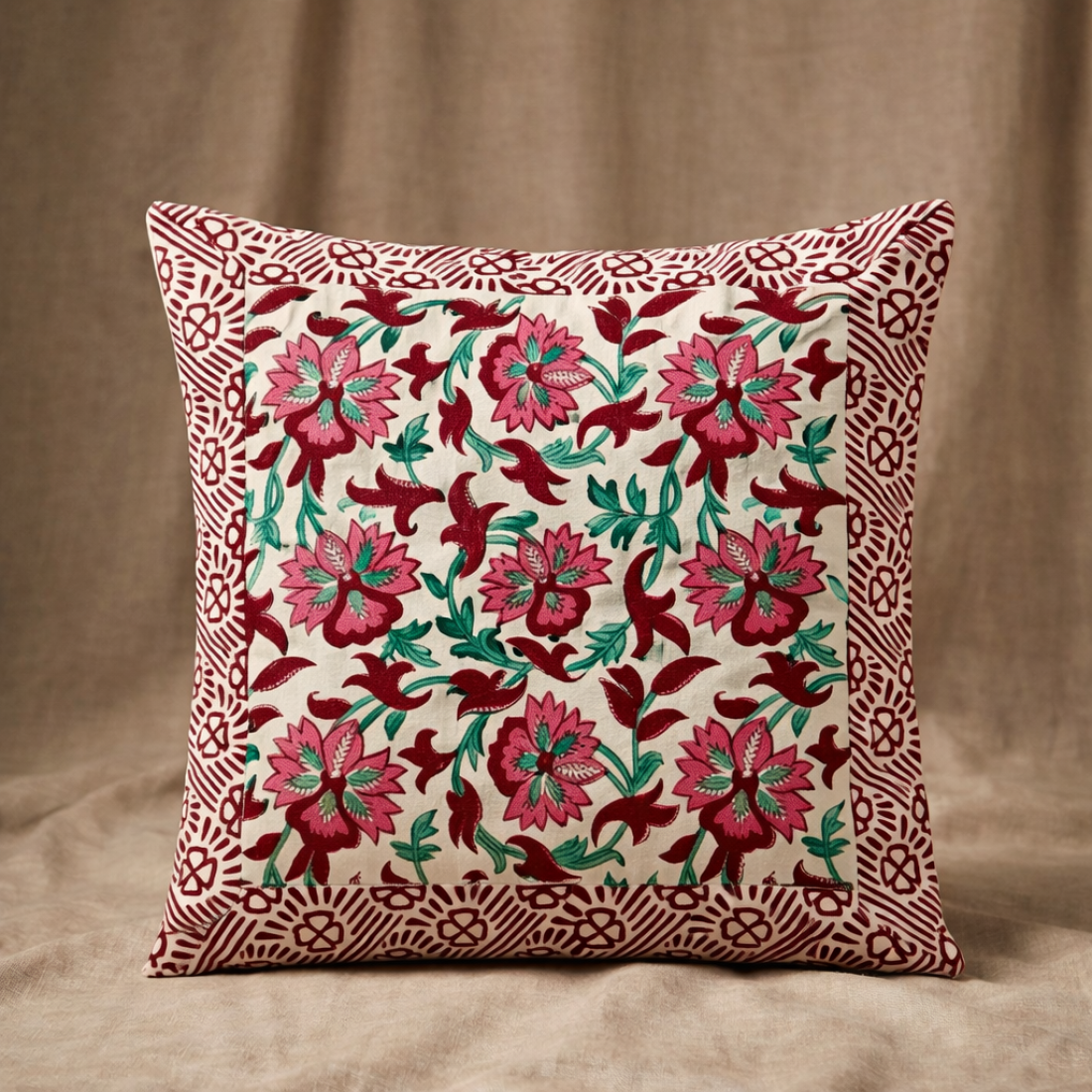 Bring timeless charm to your home décor with this Hand Block Print Cushion Cover (16x16 Inch). Crafted from high-quality cotton fabric, this cushion cover showcases a stunning floral design created using traditional hand block printing techniques. Each piece reflects the beauty of Indian craftsmanship and adds a warm, artistic touch to your living space.