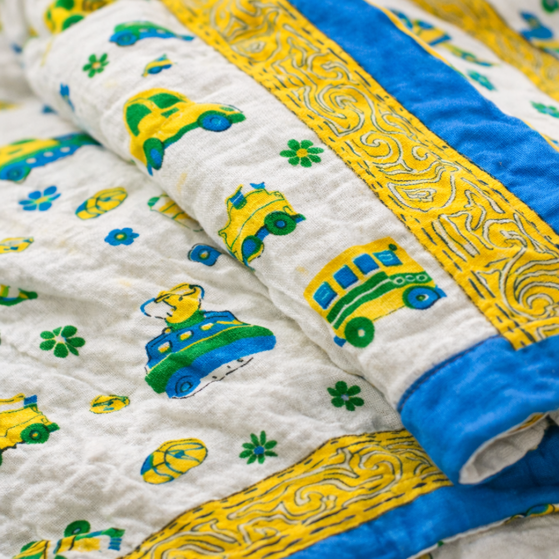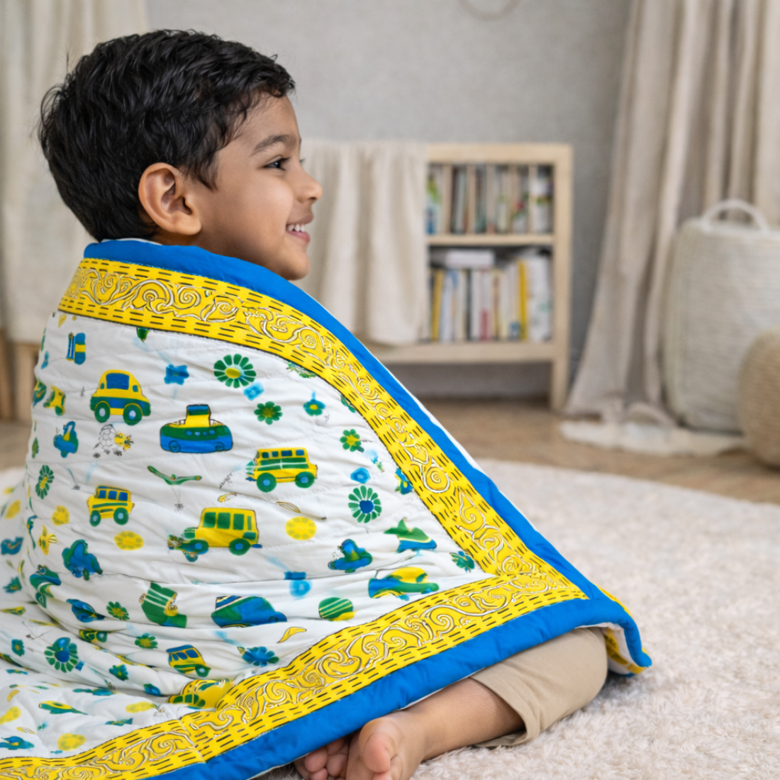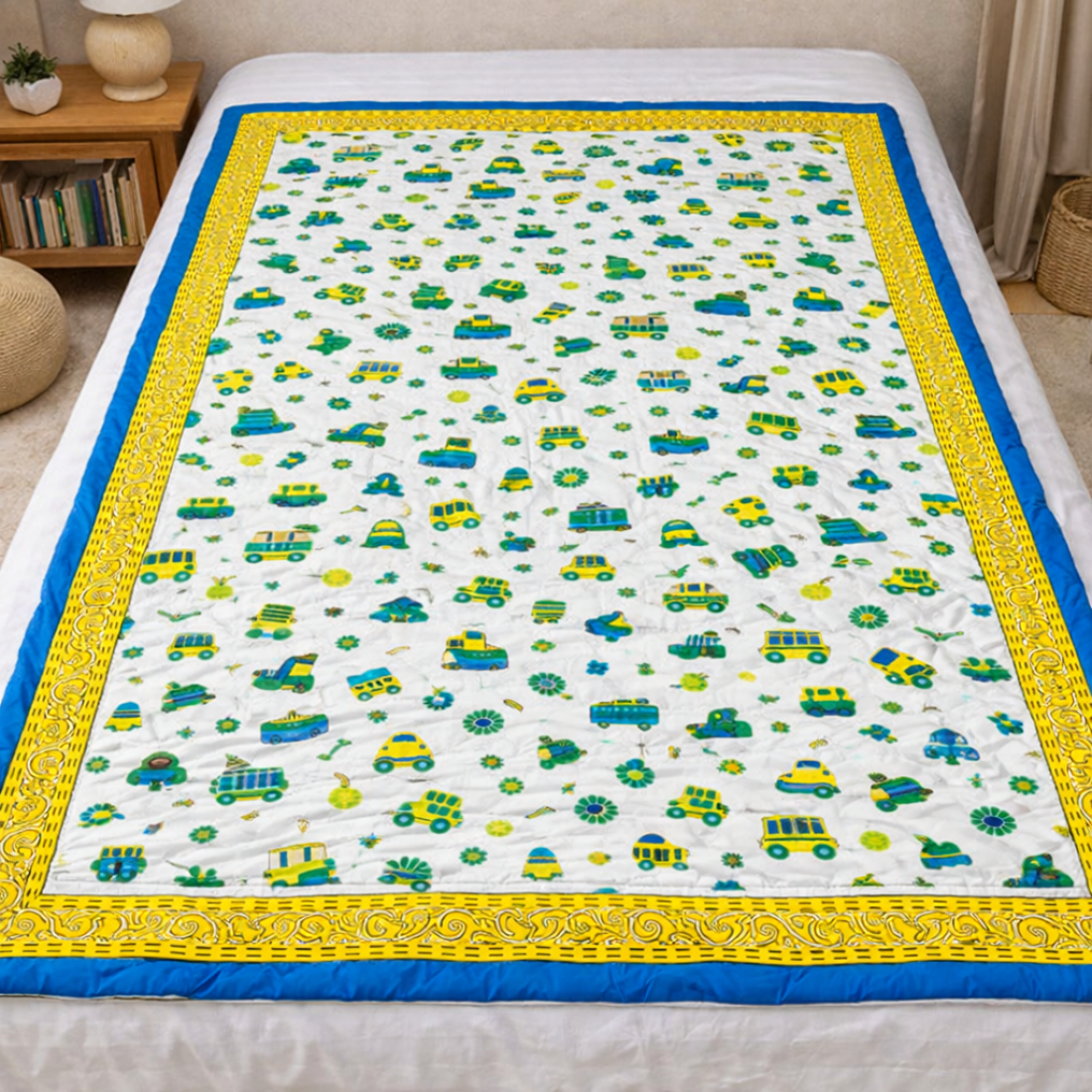 Give your child a cozy and comfortable sleep with this premium quality cotton baby quilt. Designed specially for babies and toddlers, this quilt features adorable cartoon vehicle prints with a bright blue and yellow border that kids love.
