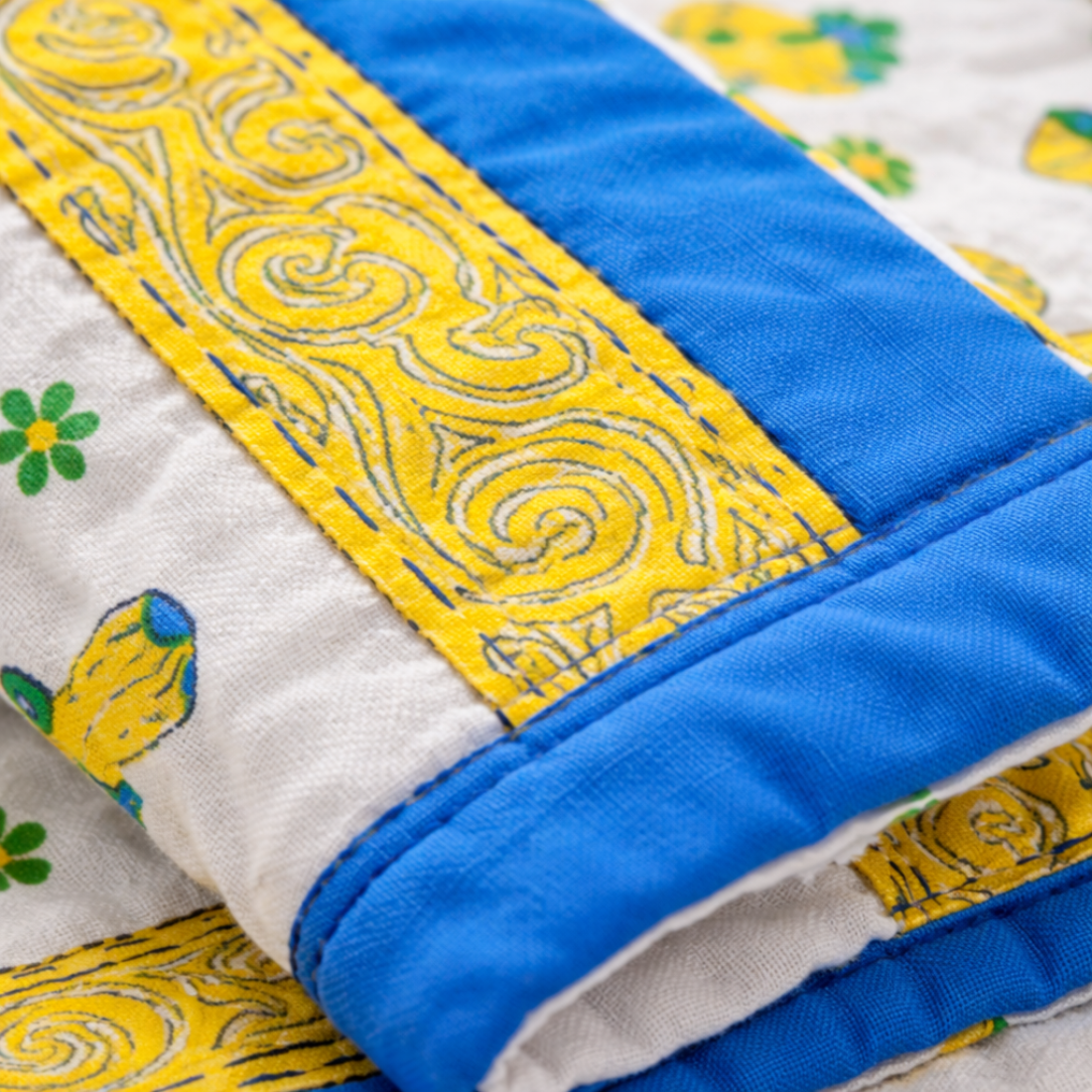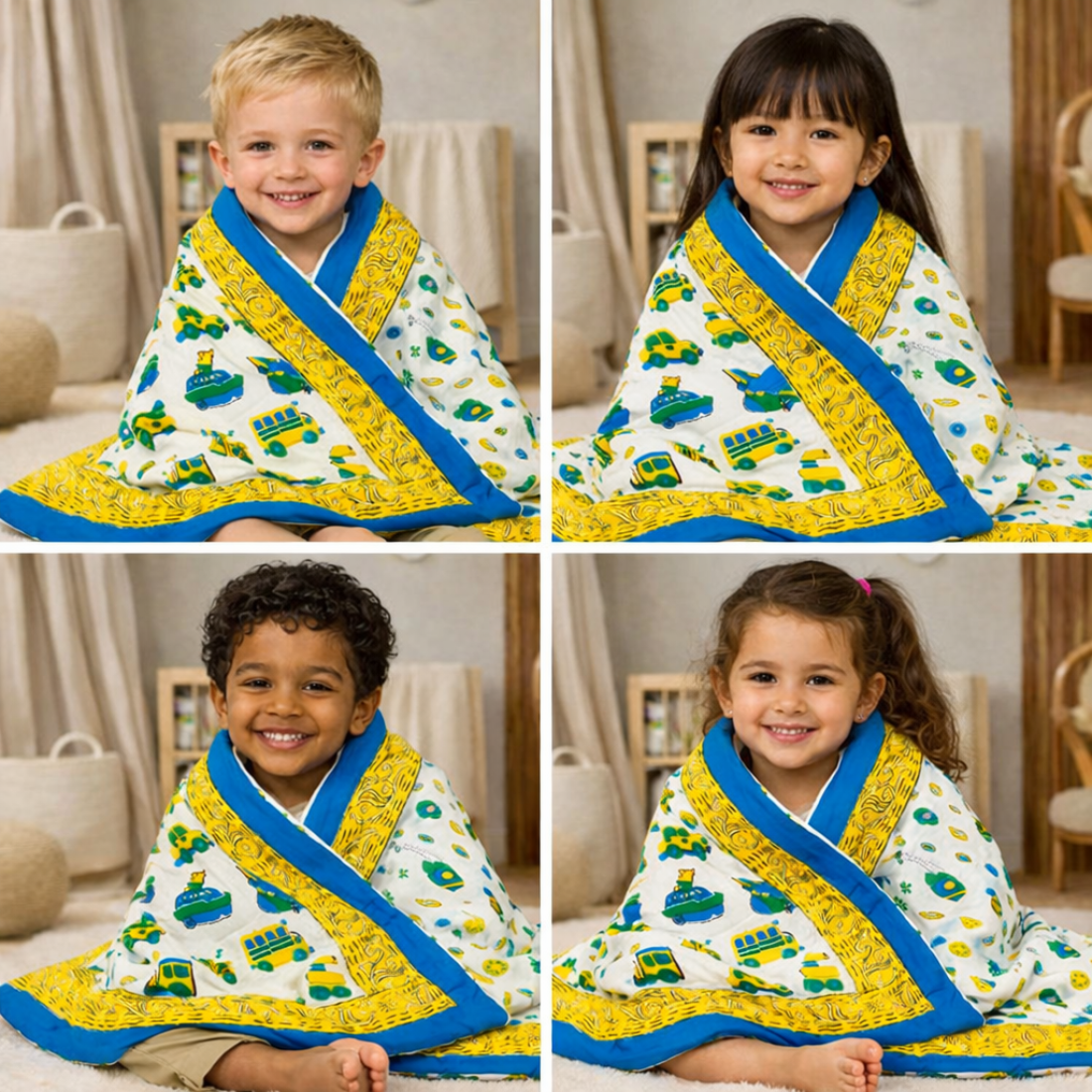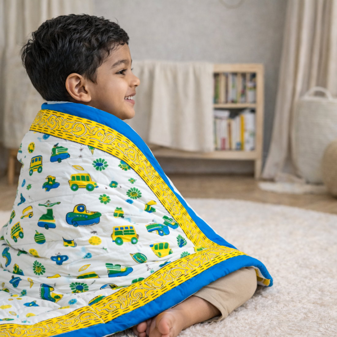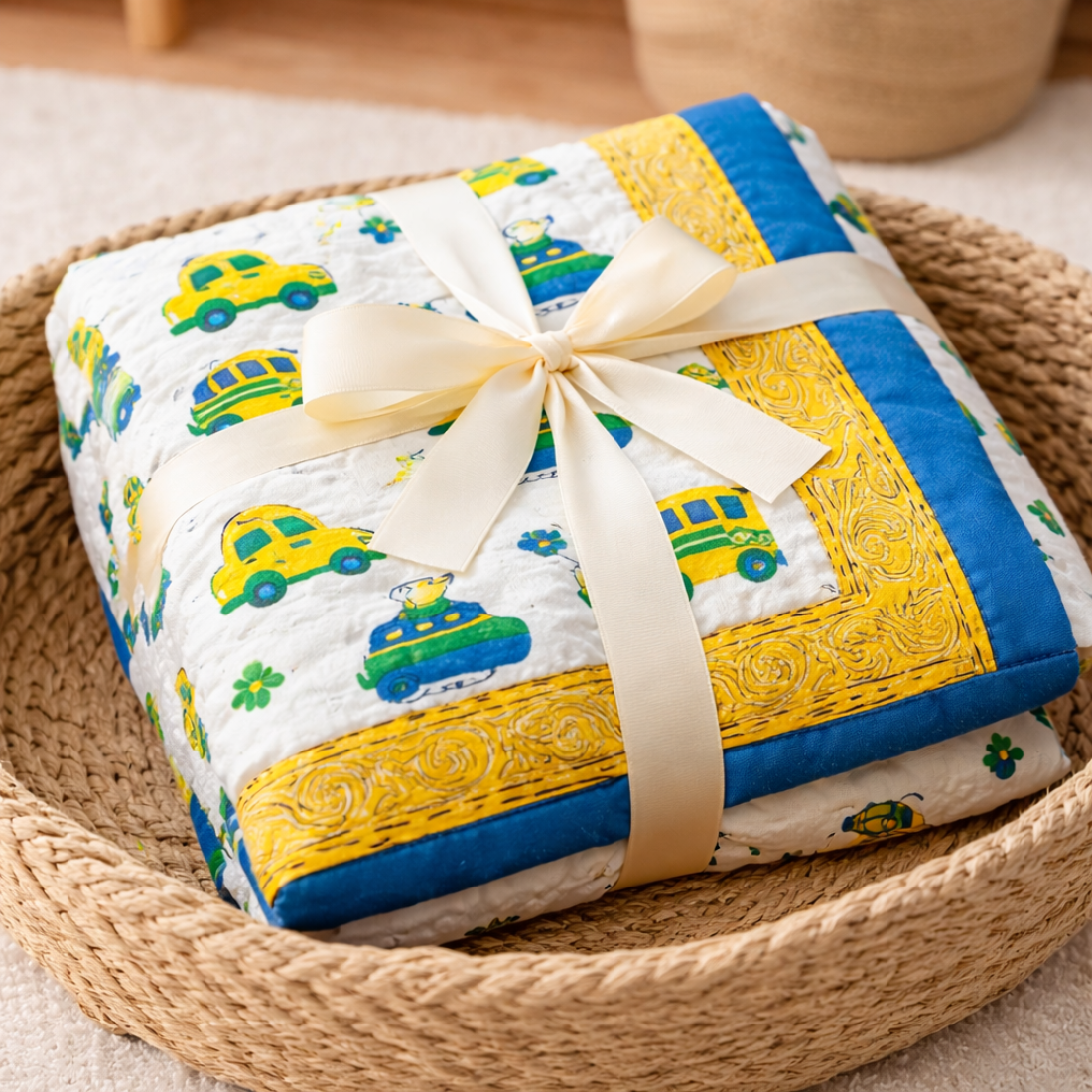 Give your child a cozy and comfortable sleep with this premium quality cotton baby quilt. Designed specially for babies and toddlers, this quilt features adorable cartoon vehicle prints with a bright blue and yellow border that kids love.
