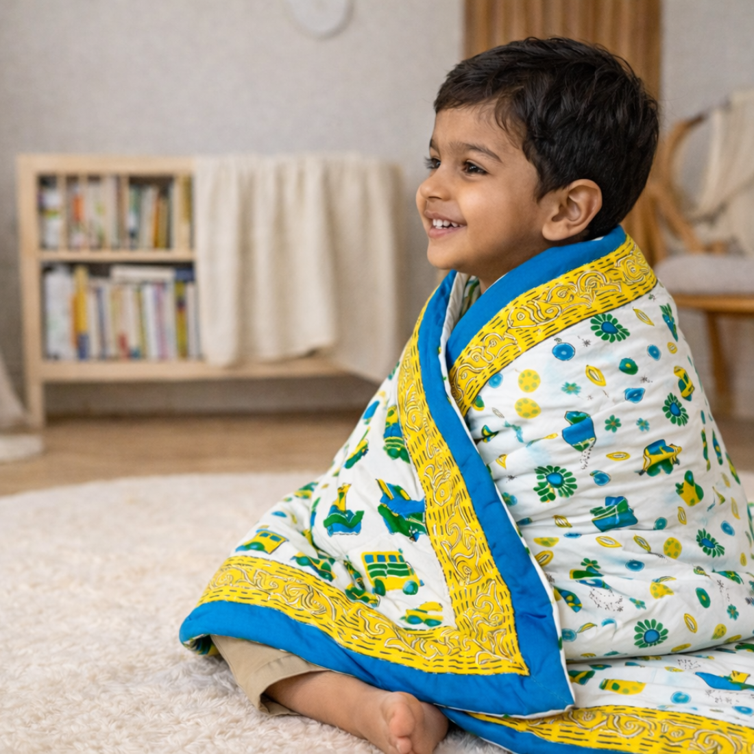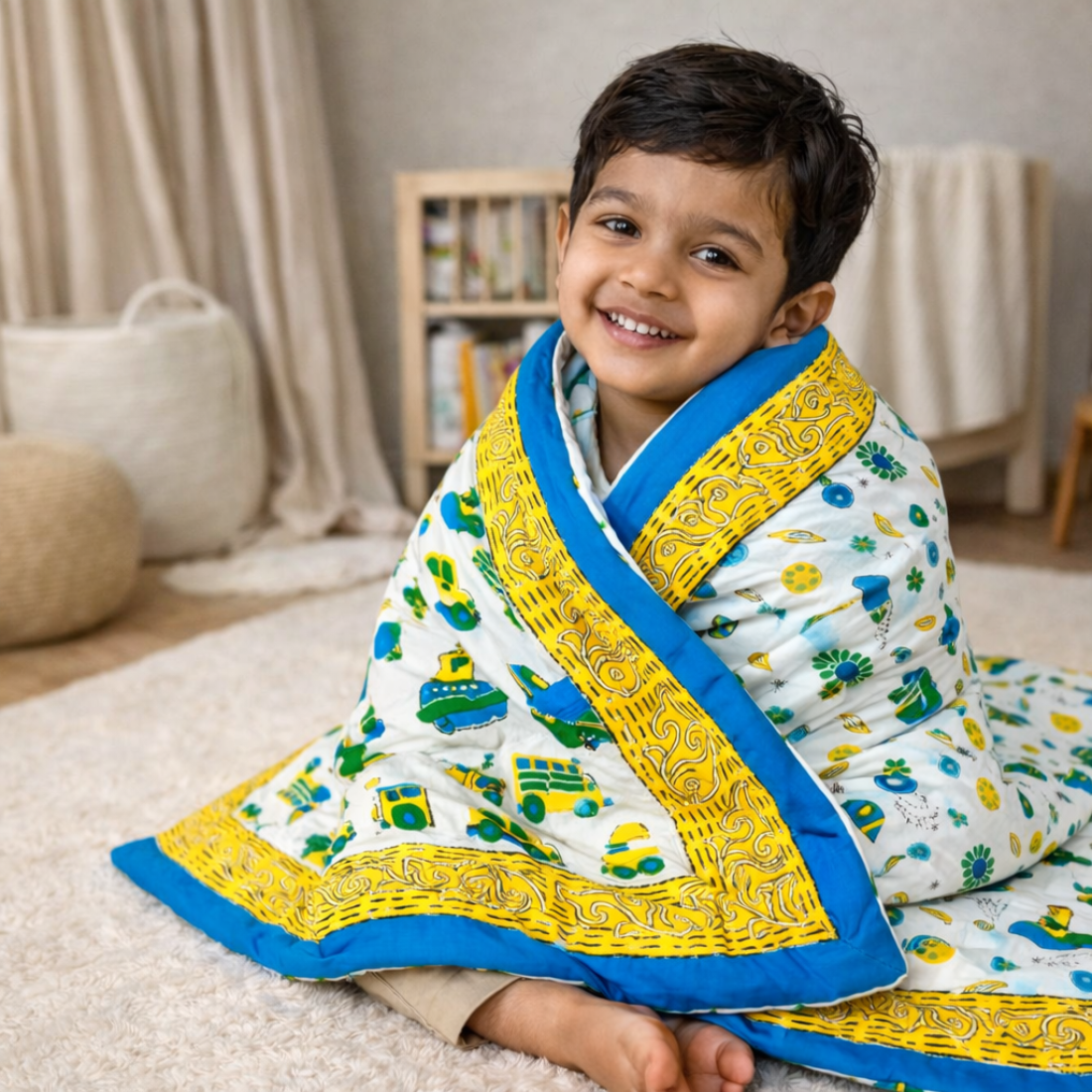 Made from soft, breathable cotton fabric, the quilt is gentle on delicate baby skin and provides warmth without feeling heavy. The lightweight filling makes it suitable for all seasons — summer AC rooms, mild winters, and everyday use.