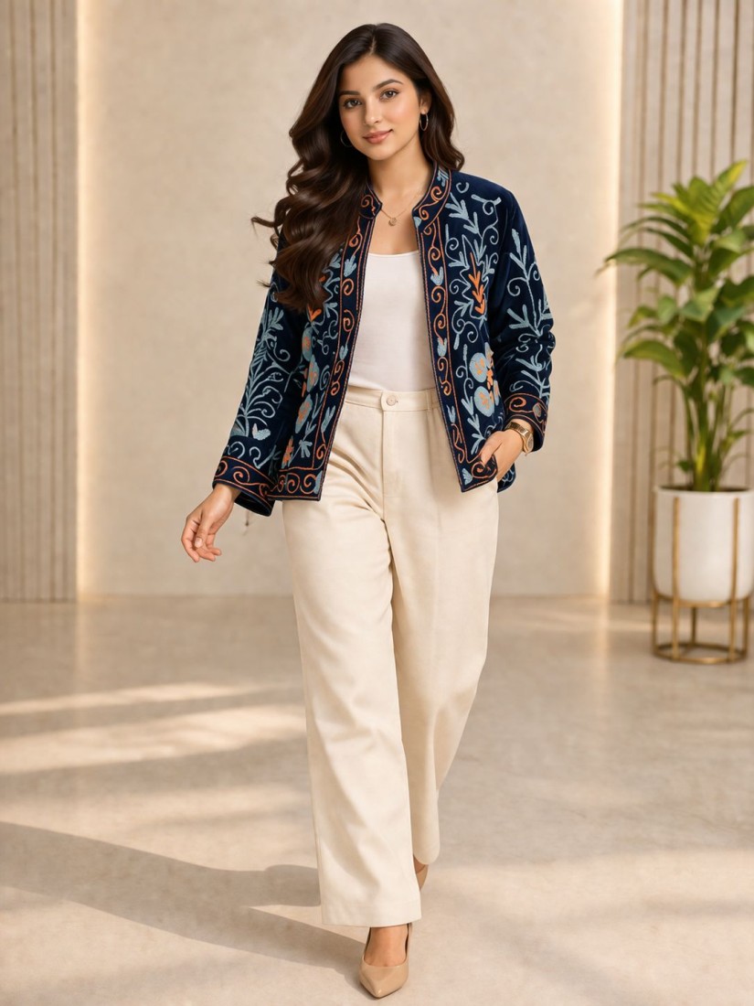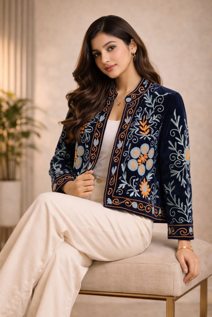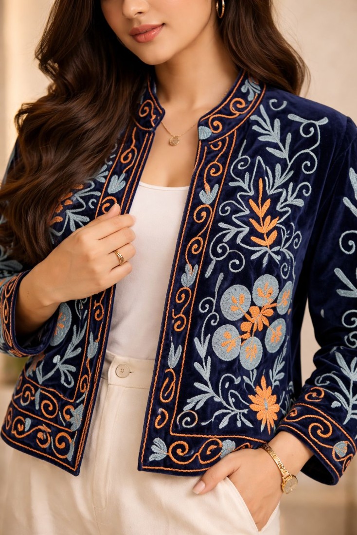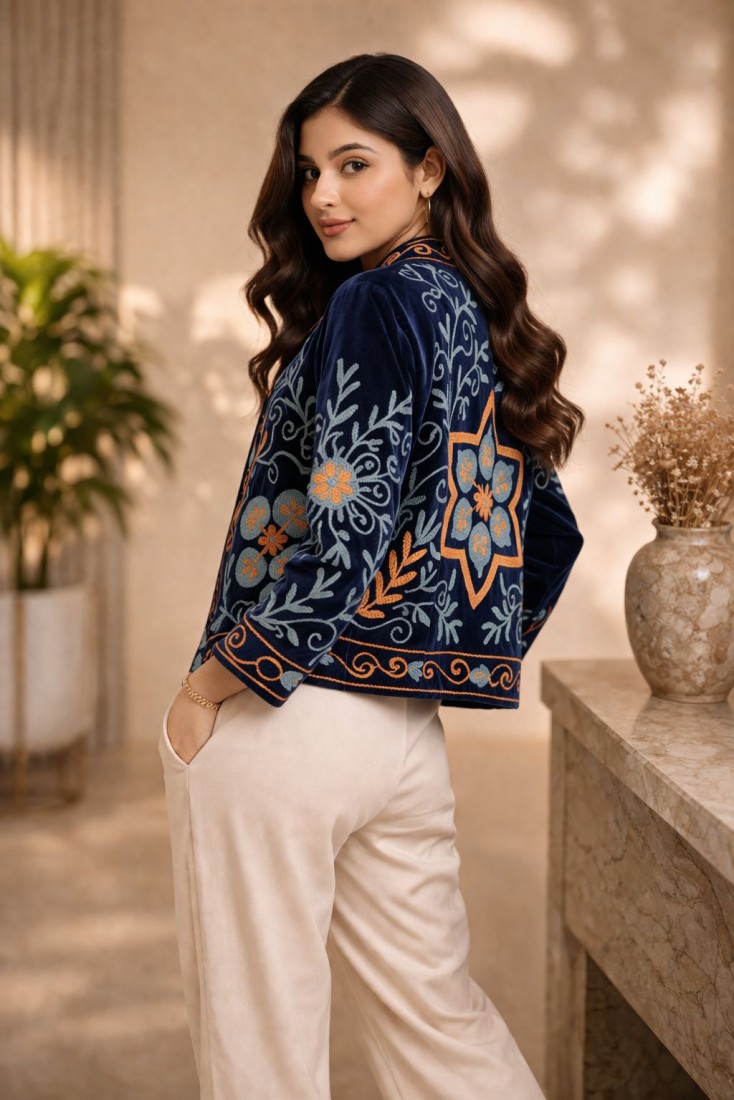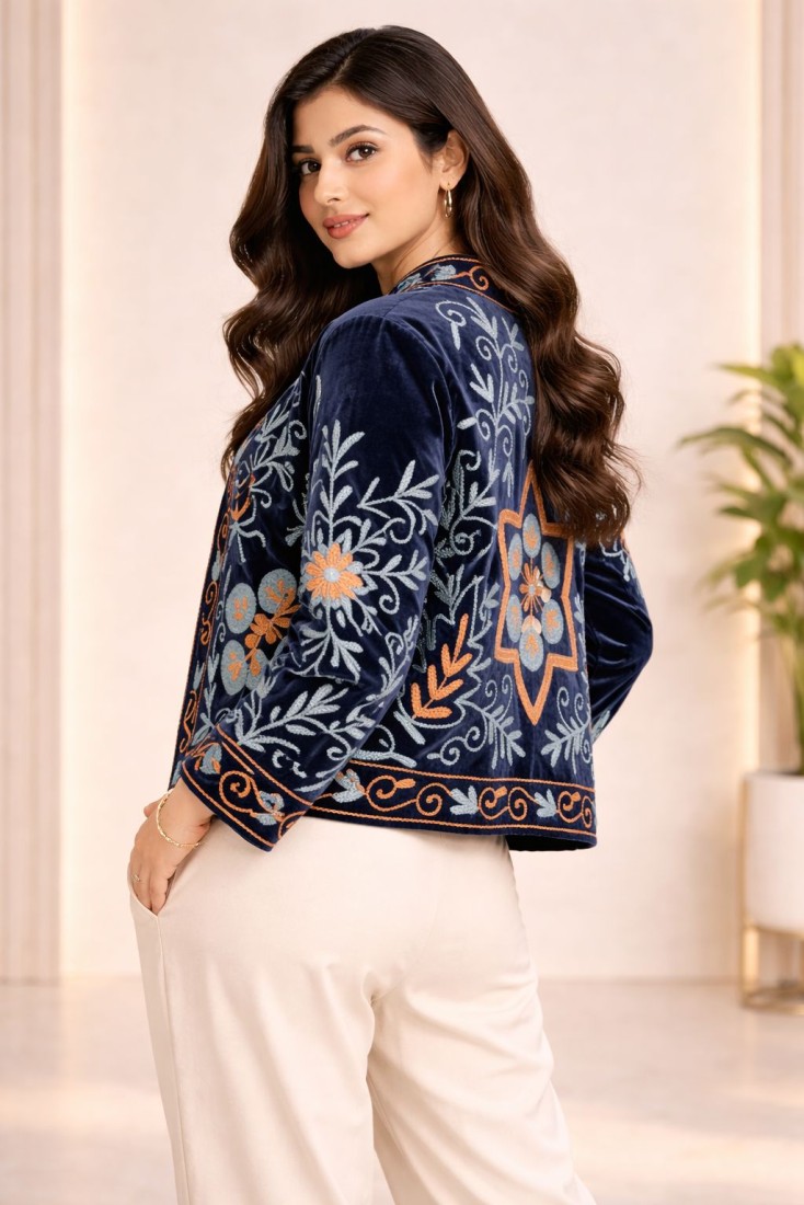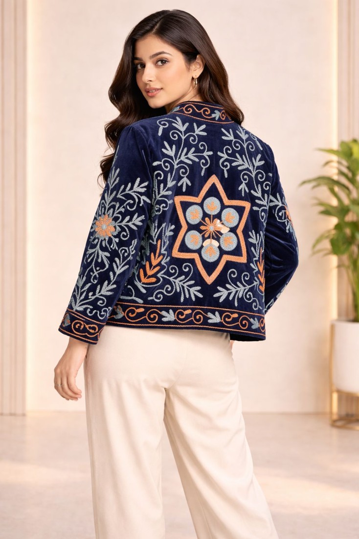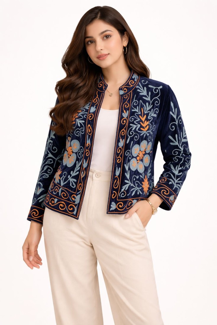 Upgrade your wardrobe with this beautifully crafted Velvet Suzani Work Jacket, designed to bring a perfect blend of tradition and modern elegance. Made from high-quality soft velvet, this jacket showcases intricate Suzani embroidery with floral and vine motifs, giving it a rich and artistic appeal.