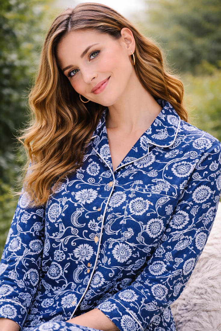 Women’s Cotton Floral Night Suit – Blue Printed Set